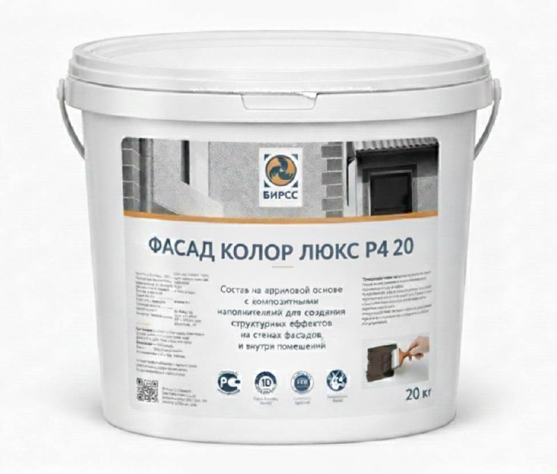 Фасад-Колор Люкс Р4 БИРСС - фасадная декоративная краска высокого качества, обладающая эффектом *сухая стена*. Такая особенность достигается за счет высокой паропропускающей способности материала в сухом виде. Влага не задерживается на поверхности, поэтому поверхность всегда сухая. Основания для покраски могут быть из бетона и кирпича, предварительно оштукатуренные и прошпаклеванные.