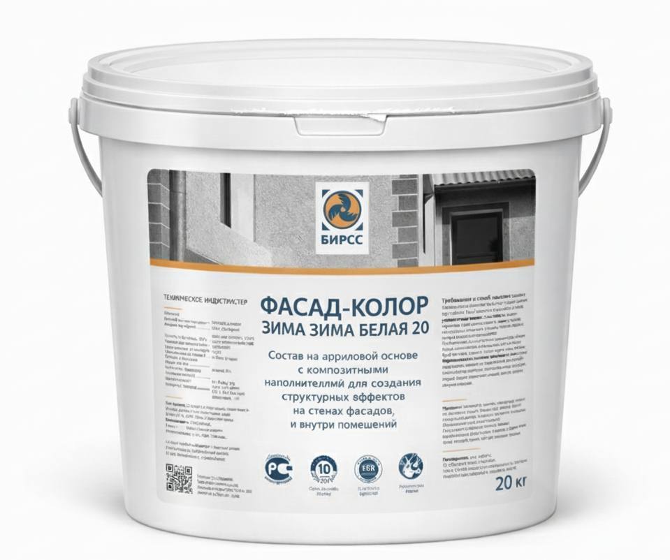 Фасад-Колор Зима белая БИРСС - декоративная краска на полиакрилатных смолах, производится на основе акрилового сополимера с добавками органических растворителей. Краска стандартно белая матовая, колеруется под заказ. Применяется как финишное декоративное покрытие на фасадах из бетона, кирпича, оштукатуренных и шпаклеванных основаниях. Также наносится на грунтованные металлические поверхности. Возможно использование для внутренних и наружных работ.