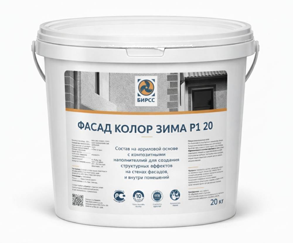 Фасад-Колор Зима Р1 БИРСС - декоративная краска на полиакрилатных смолах, производится на основе акрилового сополимера с добавлением органических растворителей. Готовая к применению. Стандартный цвет матовый белый, возможна колеровка по заказу. Структура однородная.