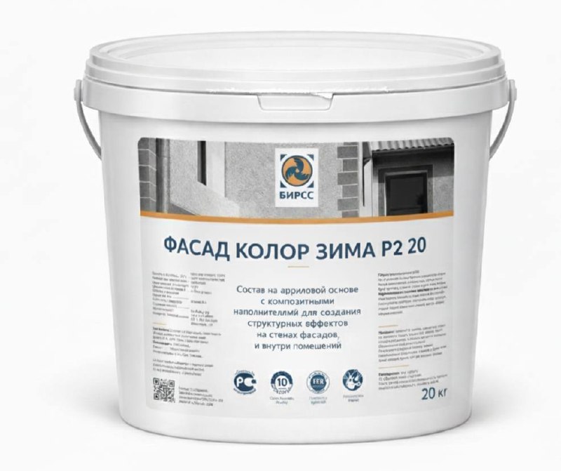 Фасад-Колор Зима Р2 БИРСС - декоративная фасадная краска на полиакрилатных смолах, состав на основе акрилового сополимера с добавками органических растворителей. Краска отличается повышенной устойчивостью к атмосферным влияниям. Используется на поверхностях из бетона, кирпича, штукатурки, шпаклеванных поверхностях, из черного металла. Рекомендована для внутренних и наружных работ. Полностью готова к применению. Однородная по структуре, матовая. Выпускается в белом цвете, колеровка возможна под заказ.
