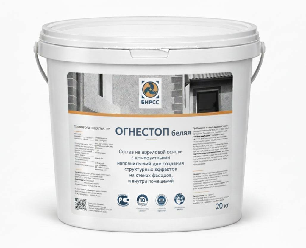 Краска Огнестоп белая БИРСС - огнезащитное покрытие, водно-дисперсионная краска, производится на основе синтетической дисперсии. Полностью готовая к применению. Цвет белый, матовый, состав однородный. Возможна колеровка под заказ в пастельные тона. Рекомендована к использованию в качестве огнезащитного покрытия внутри помещений на основаниях из бетона и металла. Используется для жилых, общественных, административных помещений, при условии влажности не более 80%.