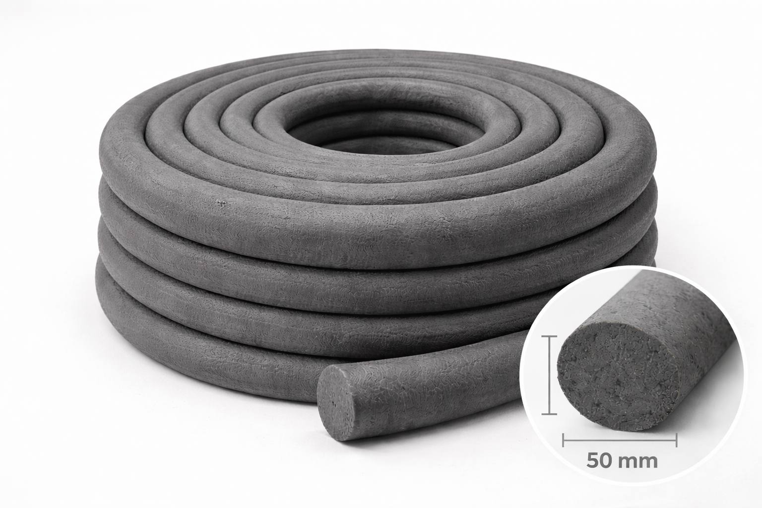 Главное свойство материала — интенсивное разбухание при контакте с влагой. При намокании бентонит значительно увеличивается в объёме, заполняет все пустоты в шве и формирует плотный водонепроницаемый барьер. Диаметр 50 мм позволяет использовать шнур в широких и глубоких швах крупногабаритных конструкций, где требуется повышенная степень герметизации.